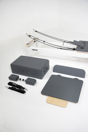 From the soft suede-lined handles to the jump board, foot plate, and box attachments, the VERVE Flow Reformer includes high-quality accessories designed to enhance every workout with comfort and versatility.