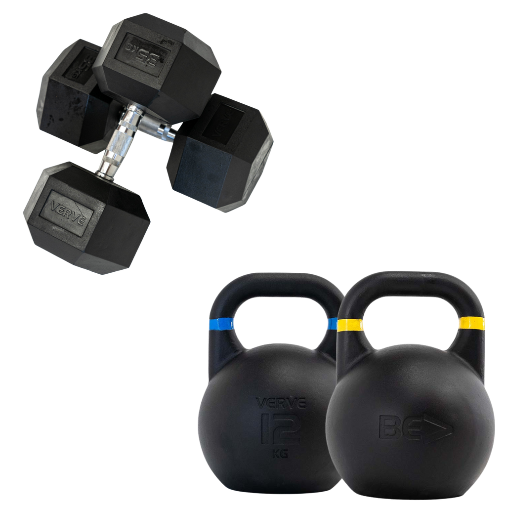 Dumbbells run from 5 kg to 25 kg in clean pairs, so you can hit shoulders, arms, chest, back, and all accessory patterns with proper progression. Competition kettlebells from 8 kg to 24 kg add swings, carries, cleans, and conditioning. Resistance bands add warm up work, joint prep, and banded variations when you want extra tension.