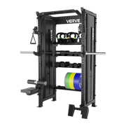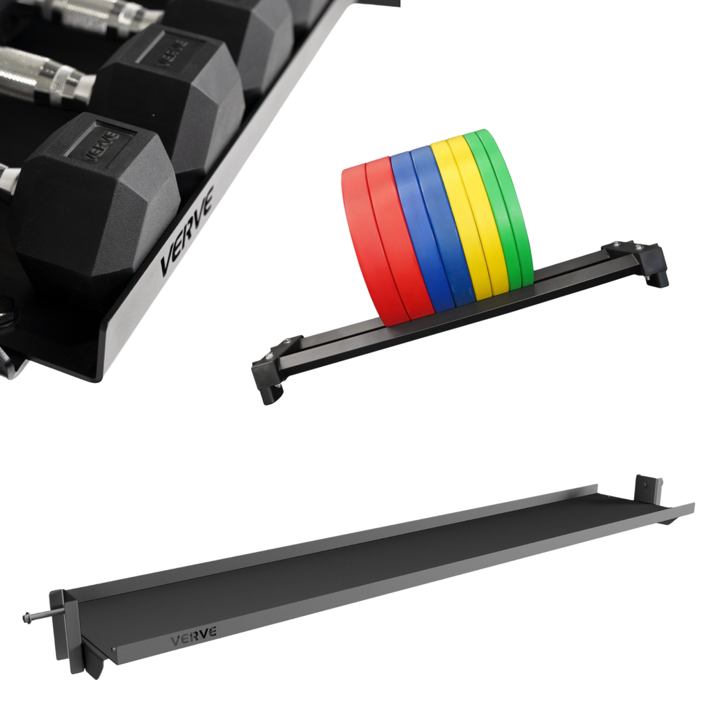 The storage shelf, dumbbell holder, and plate holder keep everything organised so the whole system stays tight and easy to train with. Every piece expands the range of movements you can do without adding clutter.
