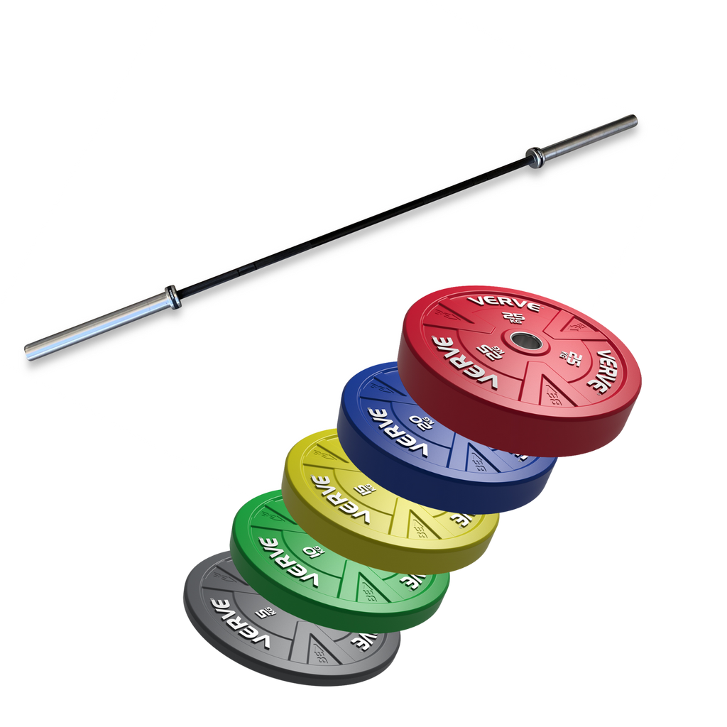 The Commercial FID Bench V2 stays steady at every angle for pressing and rowing. The 20 kg Elite Olympic Barbell and full colour bumper plate spread cover your main lifts, and magnetic collars keep plates tight when you move between loads.