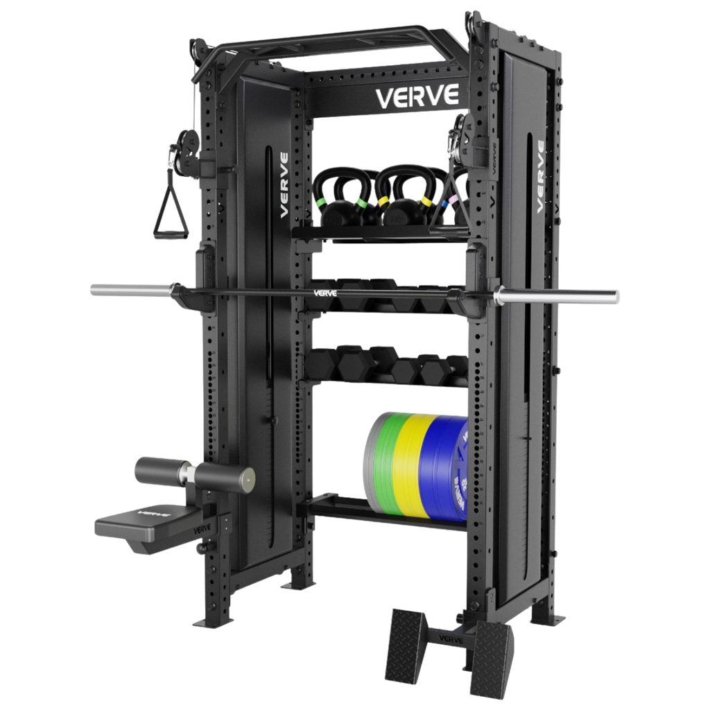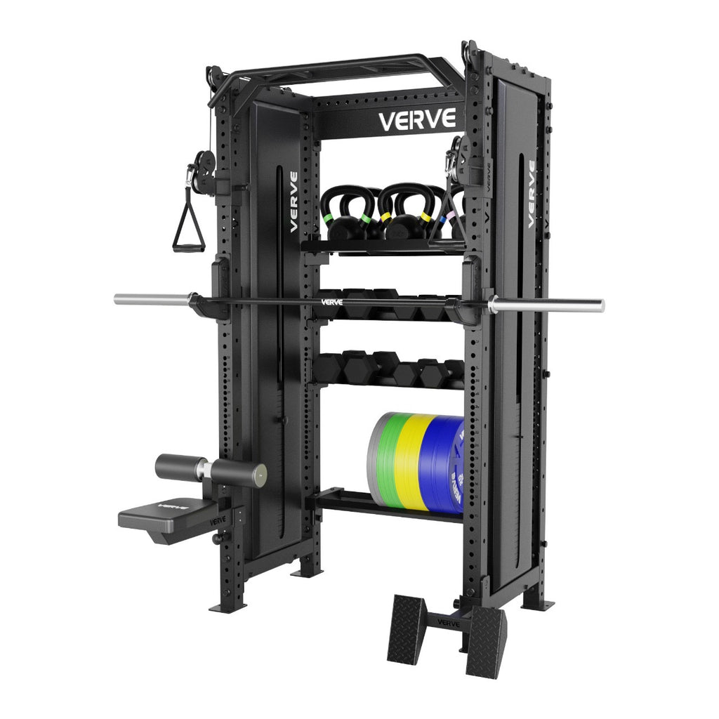This setup gives you full cable training, complete barbell work, full dumbbell and kettlebell training, and banded resistance in one space, ready to run hard from day one.