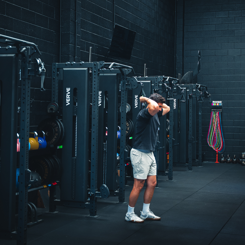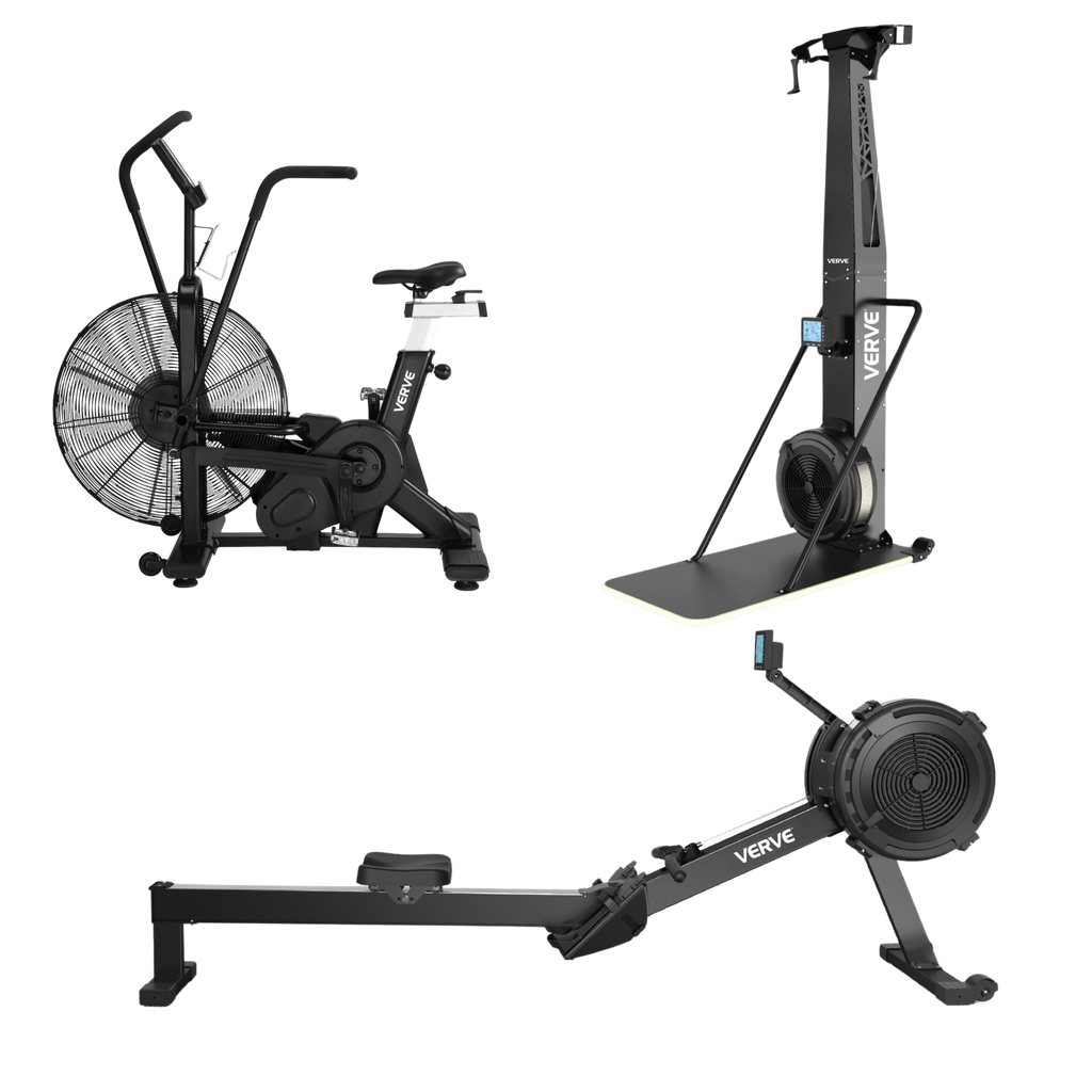 Cardio and conditioning slot straight in. The air bike builds power and capacity. The ski trainer gives you upright, full-body aerobic work. The rower delivers long efforts, sprints, and intervals with clean mechanics. Fifteen millimetre flooring ties the whole room together so every machine sits solid, and the rack feels planted.